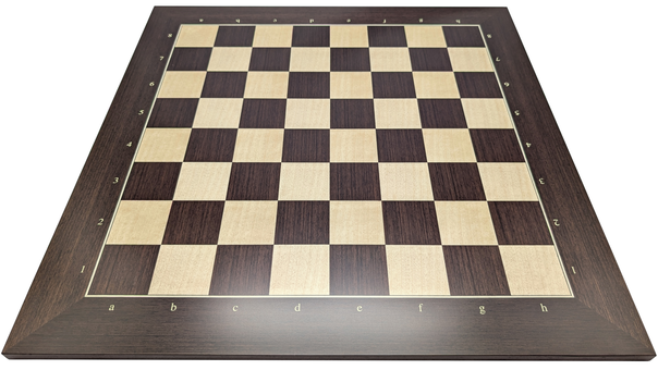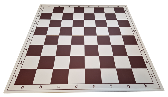 Et sammenrullbart brett med feltstørrelse 55 mm (internasjonal turneringsstørrelse) og beige og mørke brune felter, med vanlig notasjon (bokstaver og tall) langs kantene.