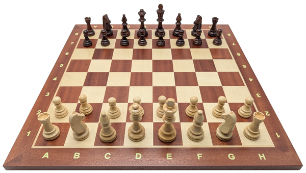 Et litt eksklusivt og passe stort sjakksett i turneringsstørrelse til hjemmebruk. Spansk-produsert sjakkbrett med felter 50 mm og diskret notasjon. Indiske sjakkbrikker av topp kvalitet.